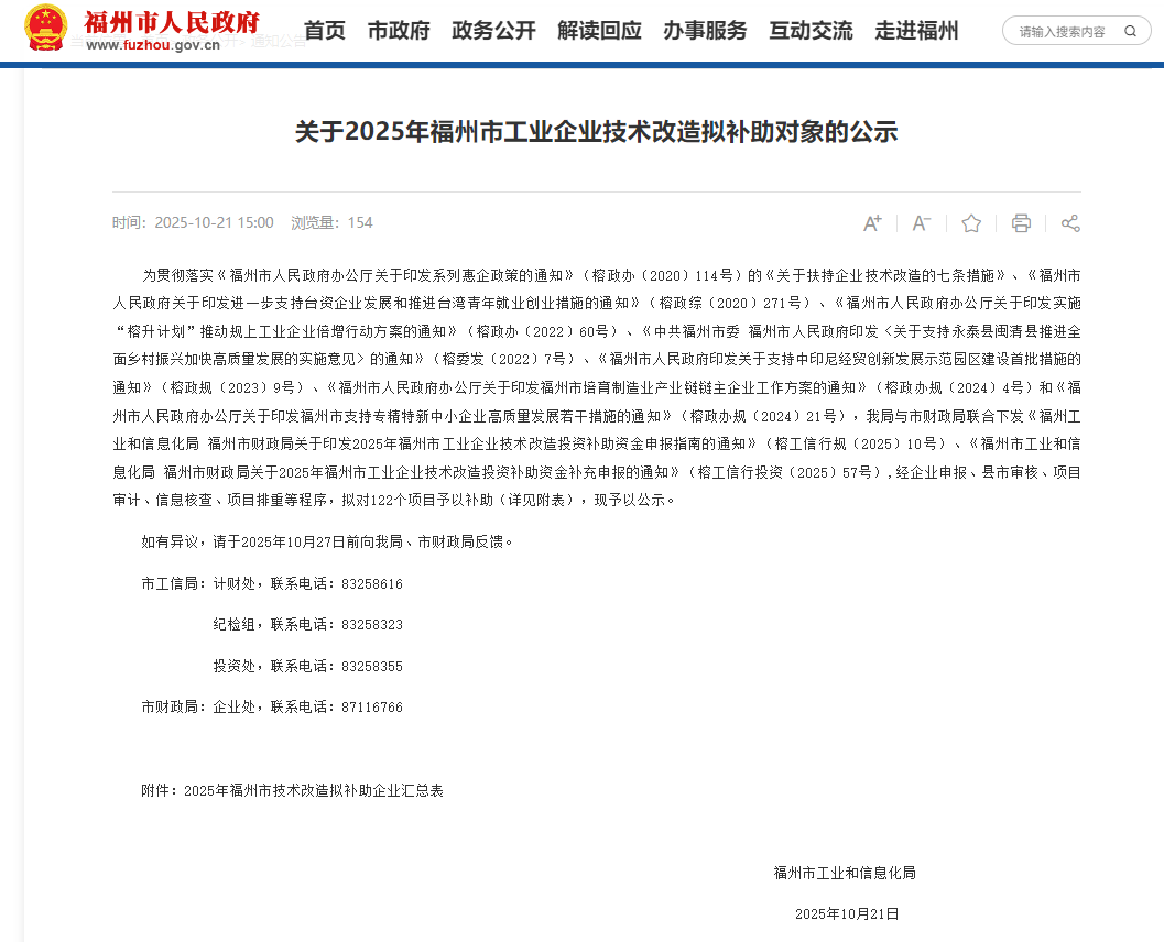 2025年10月21日,福州市工業(yè)和信息化局發(fā)布了《關(guān)于2025年福州市工業(yè)企業(yè)技術(shù)改造擬補(bǔ)助對(duì)象的公示》。