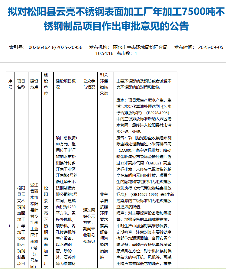 2025年9月5日,麗水市生態(tài)環(huán)境局松陽分局?jǐn)M對(duì)松陽縣云亮不銹鋼表面加工廠年加工7500噸不銹鋼制品項(xiàng)目環(huán)境影響評(píng)價(jià)報(bào)告表作出審批意見并對(duì)外進(jìn)行公告,公告期為:2025年9月5日至2025年9月11日(5個(gè)工作日)。